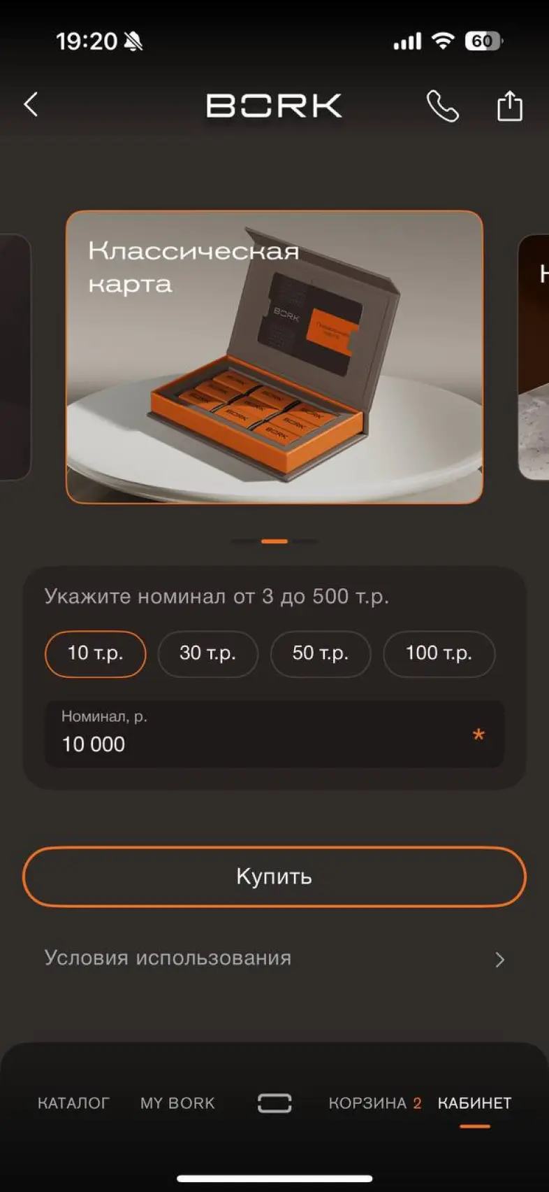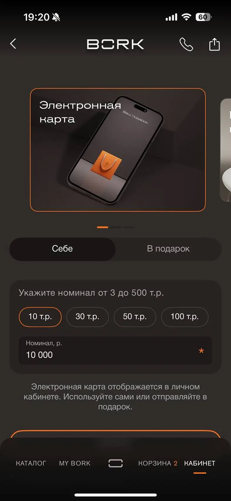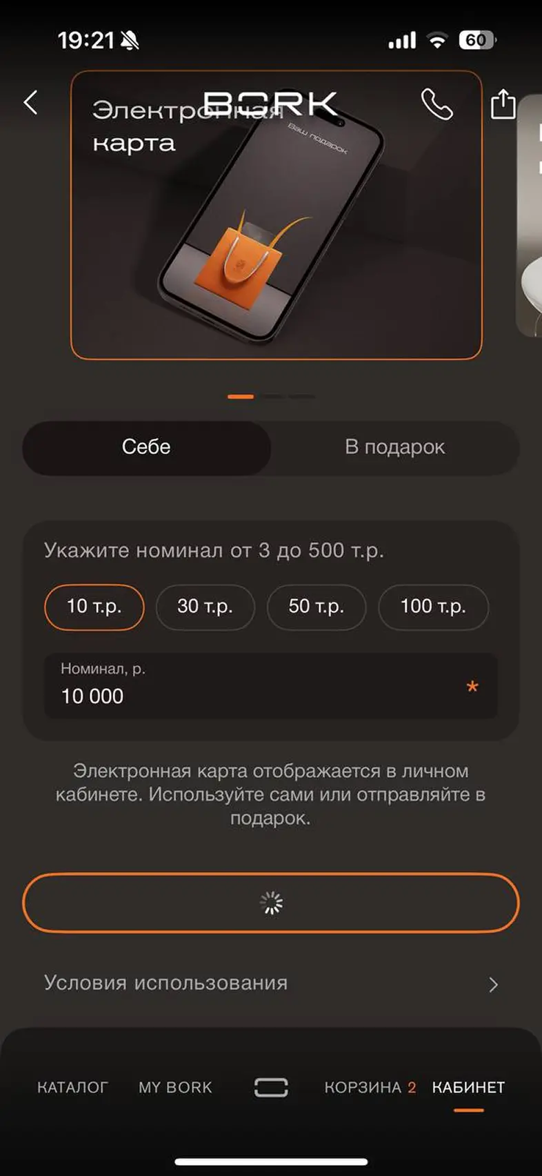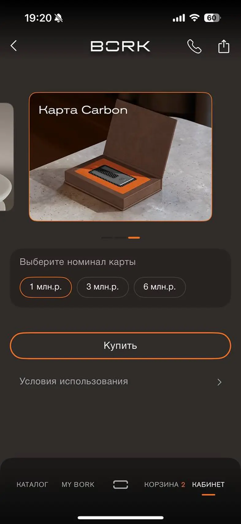 Выбрать карту привелегий и добавить в корзину