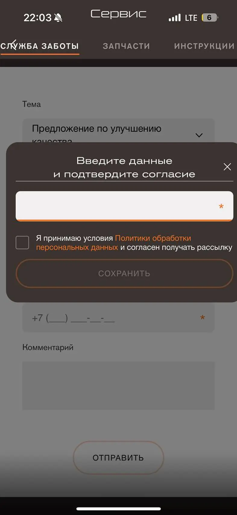 Отправка сообщения в службу заботы